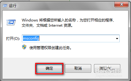 2、在运行窗口输入 msconfig,然后点击“确定”。