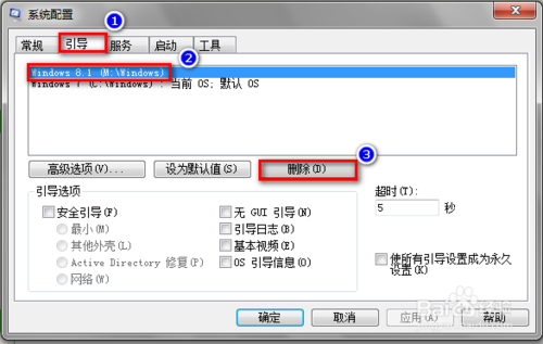 3、在打开的系统配置窗口选择“引导”选项卡,然后选中 Windows 8.1 那一行,点击“删除”按钮。