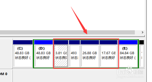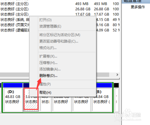 2、右键某个分区,选择“删除卷”,有几个分区就删除几个。