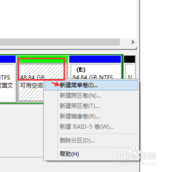 4、所有Ubuntu分区删除完后,在可用空间里面右键,点击新建简单卷。