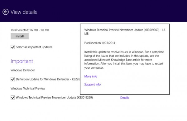微软近日面向版本号为9879的Windows 10技术预览版发布了名为“November Update”或KB3019269的系统补丁,用户可以通过Windows Update下载更新。似乎也是因为这个补丁,微软推迟向“Slow Ring”用户发送9879版本,而现在随着新补丁的推出意味着分发将会很快送到“Slow Ring”用户手中。