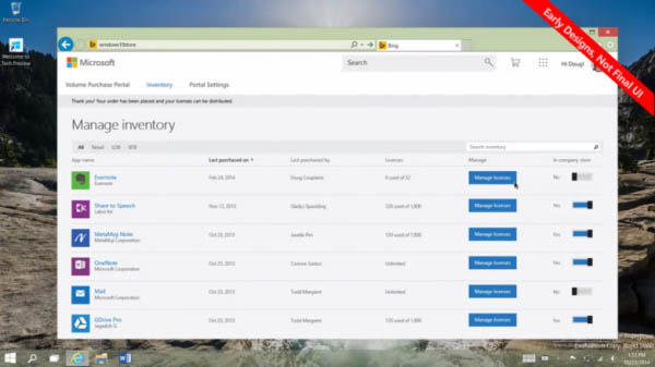需要运行独家的内部应用的大型企业(通常使用System Center配置管理器,限制在内网使用)还能获得部分有趣的新功能。这个包含私有企业入口的新的入口将会显示已经购买的Windows Store应用,并通过API级别的嵌入连接管理工具和Windows Store。这就意味着应用将会获得更多的细节,包括描述、需求、图标等等。