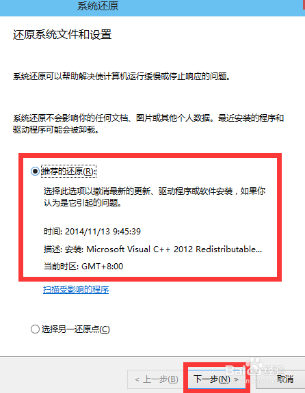 6、点击系统还原后,再点击推荐的还原或你自己创立的还原点,点击确定即可还原。