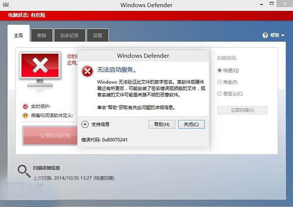 3、Windows Defender原始文件没问题,却给出这样的错误提示,也无法通过正常的服务管理页面开启该服务。该问题很有可能就是目前Windows10操作系统的一个Bug。要解决该问题,请在“开始按钮”上单击鼠标右键,然后选择其中的“命令提示符(管理员)”,输入下列命令,然后按下“回车键”。