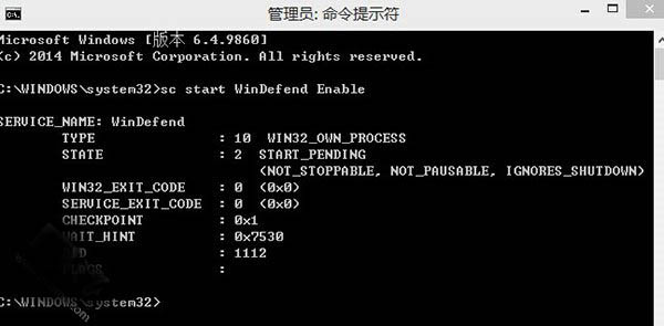 “sc start WinDefend Enable” (不包含两侧的引号)