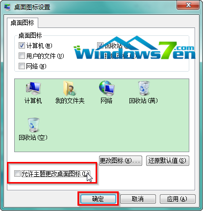 3.在“桌面图标设置”窗口中,取消点选“允许主题更改桌面图标”,点击“确定”,如图3所示: