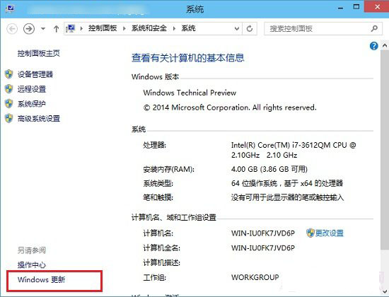 二、接下来会进入Win10系统控制面板,此时我们再点击进入左下角的【Windows更新】,如下图所示。