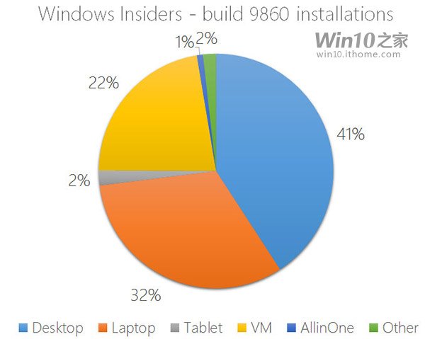 先来看看国外统计机构所做出的统计数据,在下面这个饼形图中,你可以看到有41%的用户将Windows10预览版9860安装在了桌面电脑上;32%的用户则是装到了笔记本电脑上;22%的用户比较谨慎,仅安装在了虚拟机中;2%的用户则将其用在了平板电脑上。那么,正在使用Win10预览版9860的朋友们,你把系统装在哪里了?还没有升级到Win10预览版9860的朋友,现在可以通过使用系统镜像升级安装的方式进行更新。点击此处下载脚本之家自制的Win10 Build 9860系统镜像。