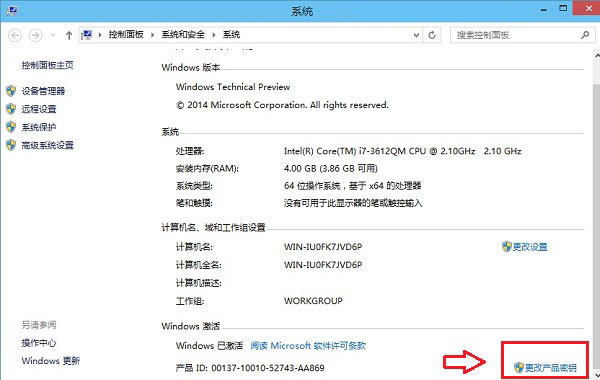 第二步:接下来就可以打开Win10【系统】界面,在其底部可以看到,目前小编Win10系统使用的是试用秘钥,点击右下角的【更改产品秘钥】即可进入Win10激活设置,如下图所示。