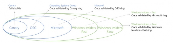 下图是微软测试版本更迭的关系图,可以看到较慢的Insiders测试版本比较快的Insiders测试版本多一个环节,需要经过更多评估,并且提升了稳定性。因此,如果你需要在主力机型上使用,请尽量选择较慢的接收测试版本速率,否则将会造成系统不够稳定。