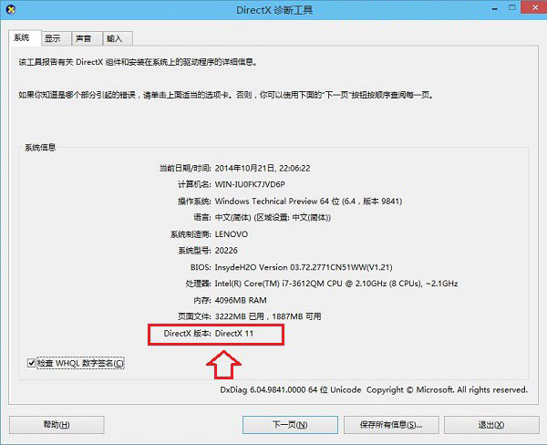 由于脚本之家小编目前使用的是Win10技术预览版,从图中可以看出,Directx版本和Win8.1一样,依旧是DirectX 11版本,并不是DirectX 12,不过即将于2015年推出的Win10正式版将内置最新的Directx12版本,正式版期间,大家可以再使用这种方法查看Win10的Directx版本。