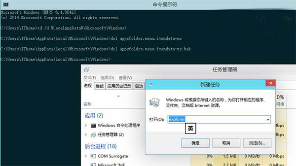4、现在,大家可以看到整个资源管理器都退出了,仅留下了我们刚刚打开的“命令提示符”窗口。不用担心,资源管理器一会儿就会回来。现在我们需要在“命令提示符中”输入两行命令,删除掉之前Windows自动生成的配置文件。Win10命令提示符支持粘贴复制,因此朋友们直接复制然后粘贴过去就好。粘贴完其中一行后,记得要按“回车”键,没有任何提示,继续下一行就好。