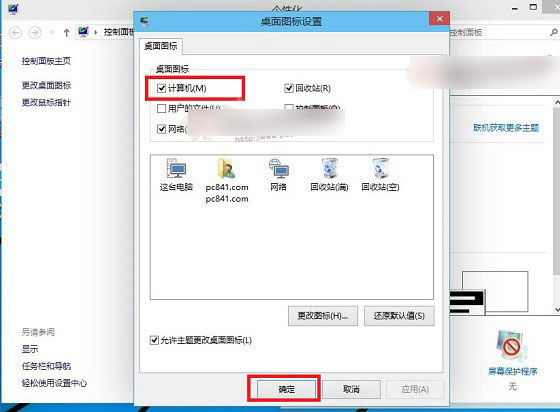 三、进入桌面图标设置后,我们在桌面图标下面的【计算机】前面的√选上,如果还需要Win10桌面显示控制面板、网络图标的话,也可以都勾选上,完成后,点击底部的【确定】就可以了,如下图界面所示。