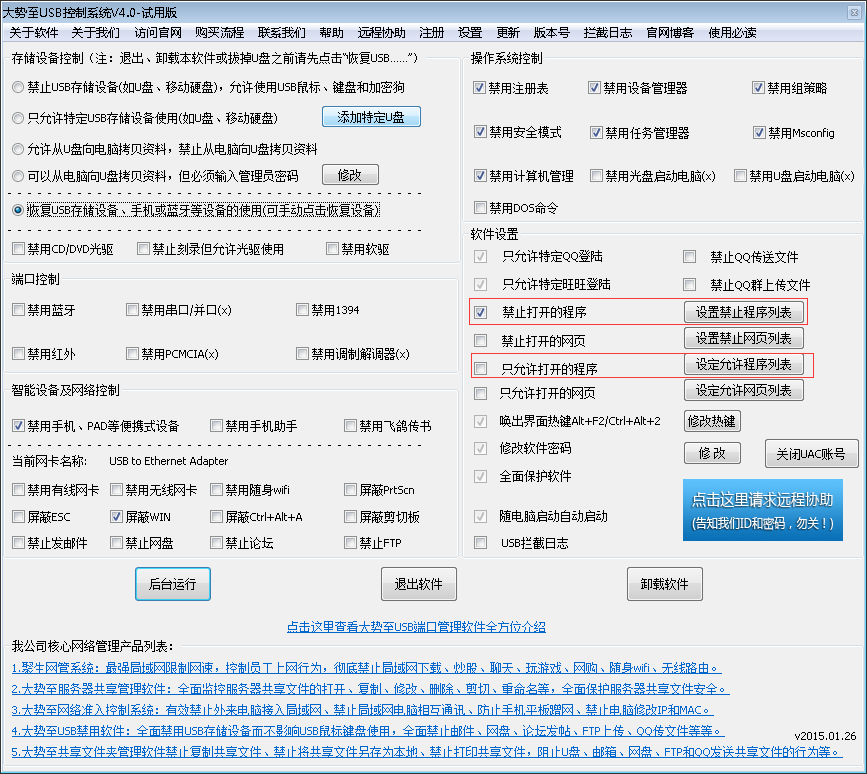 目前,市面上有很多禁止电脑随意安装程序的软件,可以有效禁止电脑随便安装软件、禁止随意运行程序的行为。例如有一款“大势至电脑USB控制软件”(下载地址:http://www.grablan.com/monitorusb.html),有一个“禁止打开的程序”功能,在后面点击“设置程序禁止列表”这里添加你想禁止安装的程序、禁止运行的软件名称即可轻松禁止程序的安装和运行,操作极为简单。同时,你也可以选择“只允许打开的程序”,然后添加你允许运行的程序,则其他所有未被允许的程序都无法运行了。如下图所示: