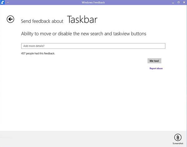 考虑到该问题的反馈数量较高,因此微软很有可能采纳该建议。不过,隐藏这两个按钮,特别是隐藏其中的任务预览按钮,就将失去从桌面上点击进入多桌面环境的唯一入口。除了提供快捷键之外,微软还会采用怎样的解决方式呢?微软公司承诺将留意用户的反馈并进行仔细分析,一些支持人数较多的建议将被加入到Win10的正式版本中。正在使用Win10预览版的用户们也可以通过反馈功能向微软提出自己的建议,说不定也会被采纳呢。