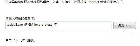 2.然后在输入对象的位置中输入:taskkill.exe /F /IM iexplore.exe /T并点击下一步。