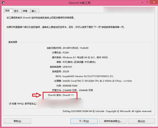 二、在打开的Directx诊断工具“系统”选项卡下,就可以找到Win8或者Win8.1的Directx版本了,如下界面图所示,Win8.1集成的Directx版本是Directx11。
