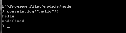 看nodeJS是否安装成功,查看其版本号 node -v 然后简单地测试一下,先输入node命令,然后直接控制台输入console.log("hello");