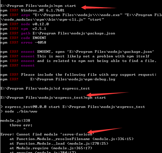 看到没有,第一步出错了,因为它不知道是什么项目,所以要先进入你想要启动的项目。cd express_test
