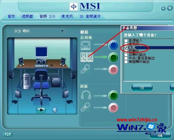 2、同样选择“音频I/O”,然后将后面板声音输出默认的“喇叭输出”改为“耳机”,这是整个HD声卡设置最关键的一步,然点击ok即可。