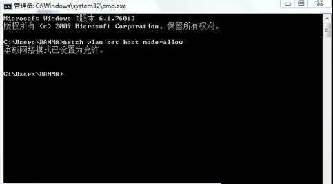 3、然后依次执行命令netsh wlan set host mode=allow以及netsh wlan start host即可。