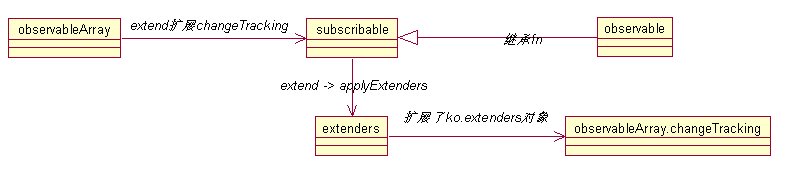 // Define prototype for observablesvar observableFn = {"equalityComparer": valuesArePrimitiveAndEqual,peek: function() { return this[observableLatestValue]; },valueHasMutated: function () { this["notifySubscribers"](this[observableLatestValue]); },valueWillMutate: function () { this["notifySubscribers"](this[observableLatestValue], "beforeChange"); }};6.返回observable方法的实现(如果传入参数就是设置,无参则是获取)ko.observableArray = function (initialValues) {initialValues = initialValues || [];if (typeof initialValues != "object" || !("length" in initialValues))throw new Error("The argument passed when initializing an observable array must be an array, or null, or undefined.");var result = ko.observable(initialValues);ko.utils.setPrototypeOfOrExtend(result, ko.observableArray["fn"]);return result.extend({"trackArrayChanges":true});};2.3、subscribable(订阅对象类)subscribe: function (callback, callbackTarget, event) {var self = this;event = event || defaultEvent;var boundCallback = callbackTarget ? callback.bind(callbackTarget) : callback;var subscription = new ko.subscription(self, boundCallback, function () {ko.utils.arrayRemoveItem(self._subscriptions[event], subscription);if (self.afterSubscriptionRemove)self.afterSubscriptionRemove(event);});if (self.beforeSubscriptionAdd)self.beforeSubscriptionAdd(event);if (!self._subscriptions[event])self._subscriptions[event] = [];self._subscriptions[event].push(subscription);return subscription;}3.extend:此方法用于添加extends方法加入的扩展类(如observableArray.changeTracking扩展类)function applyExtenders(requestedExtenders) {var target = this;if (requestedExtenders) {ko.utils.objectForEach(requestedExtenders, function(key, value) {var extenderHandler = ko.extenders[key];if (typeof extenderHandler == "function") {target = extenderHandler(target, value) || target;}});}return target;}2.5、observableArray.changeTracking(扩展监控对象的一个具体实现)