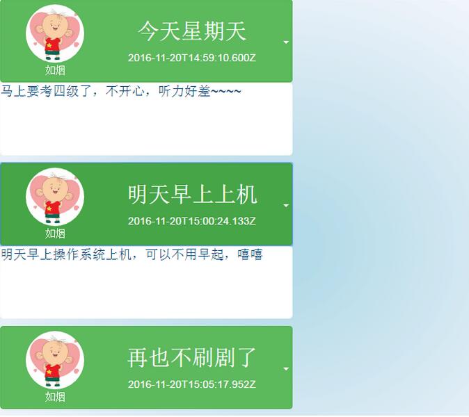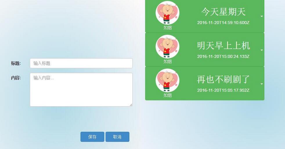 function save_diary(){ var headle = document.getElementById("headle").value; var cont = document.getElementById("diary").value; if (headle != "" && cont != "") {var storage = window.localStorage;if (storage.diary != undefined){ var diary = storage.getItem("diary"); var jsonObj = JSON.parse(diary); var diaryItem = {headle:headle,diary:cont,date:new Date() };jsonObj.push(diaryItem); var data = JSON.stringify(jsonObj); storage.setItem("diary",data); }else{ var jsonObj = [{headle:headle,diary:cont,date:new Date() }];var diary = JSON.stringify(jsonObj); storage.setItem("diary",diary);} } else {alert("标题和内容不为空哦");}}