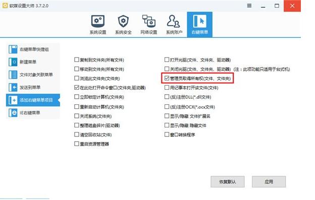 ① 勾选软媒设置大师→右键菜单→添加右键菜单项目中的“管理员取得所有权(文件、文件夹)”,点击“应用”。
