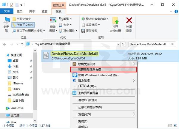 ② 在目标文件上点右键,选择“管理员取得所有权”(若弹出UAC提示,点击“是”)。
